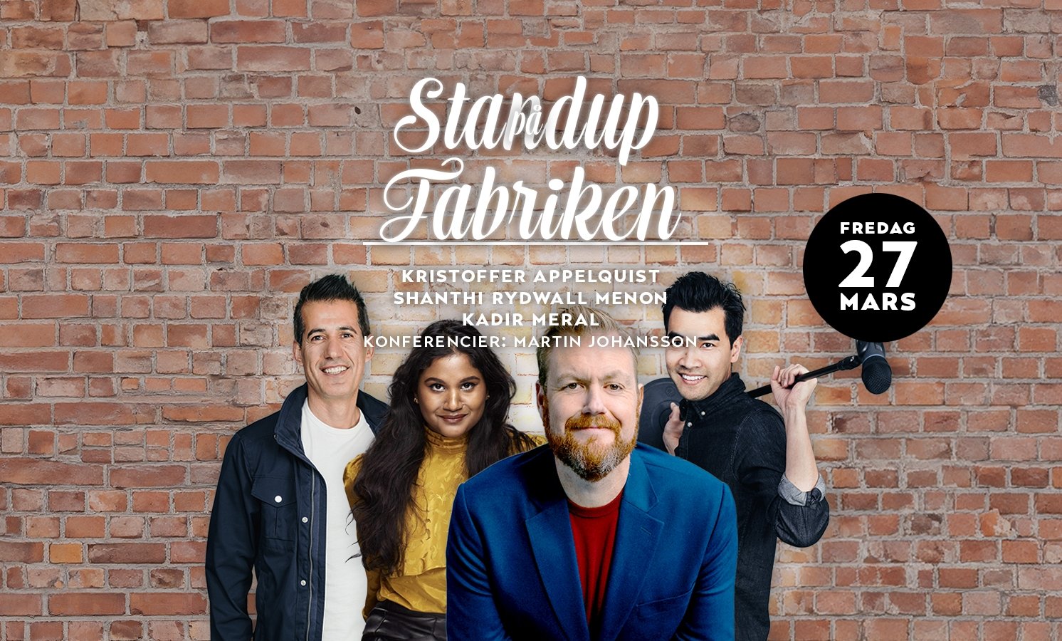 Kom på standup på Fabriken den 27 mars 2026. Vi bjuder in till en kväll med skratt, något gott i glaset och tre komiker som levererar punchlines snabbare än vi hinner fylla på i baren. Ta med kollegorna, dejten eller bästa gänget.